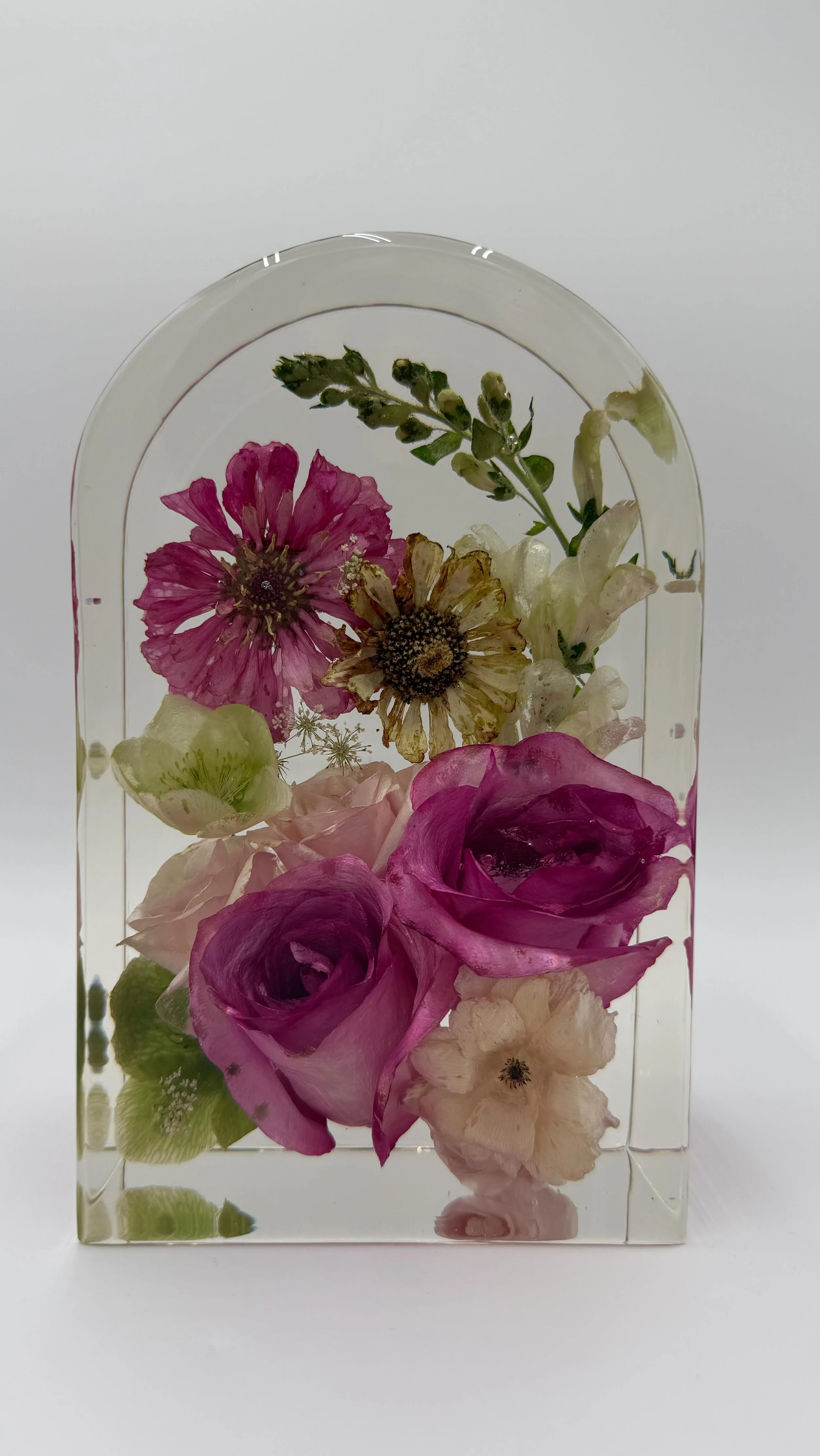 Using high-quality epoxy resin and various molds, we craft each piece carefully, emphasizing the beauty and individuality of your flowers. Contact us to turn your flowers into a lasting work of art!